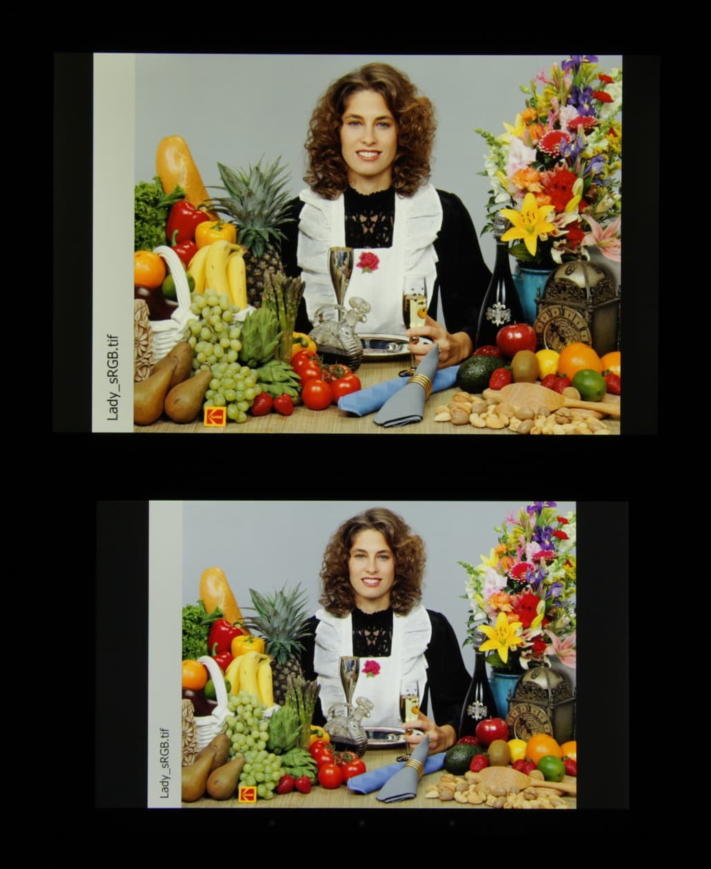 В итоге визуально цвета имеют немного уменьшенную насыщенность. Баланс оттенков на шкале серого далеко не идеальный, так как цветовая температура не очень отклоняется от стандартных 6500 К, но отклонение от спектра абсолютно черного тела (ΔE) великовато даже для потребительского устройства. Впрочем, при этом вариация цветовой температуры и ΔE небольшая, что положительно сказывается на визуальном восприятии цветового баланса. (Самые темные области шкалы серого можно не учитывать, так как там баланс цветов не имеет большого значения, да и погрешность измерений цветовых характеристик на низкой яркости большая.)
