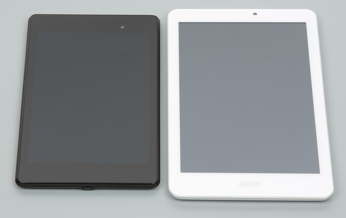 Лицевая поверхность экрана выполнена в виде стеклянной пластины с зеркально-гладкой поверхностью, устойчивой к появлению царапин. Судя по яркости отраженных объектов, антибликовые свойства экрана заметно хуже, чем у Google Nexus 7 (2013) (далее просто Nexus 7). Для наглядности приведем фотографию, на которой в выключенных экранах обоих планшетов отражается белая поверхность (Acer Iconia Tab 8 W — справа, на всех следующих сравнительных фотографиях тестируемый планшет расположен выше Nexus 7):
