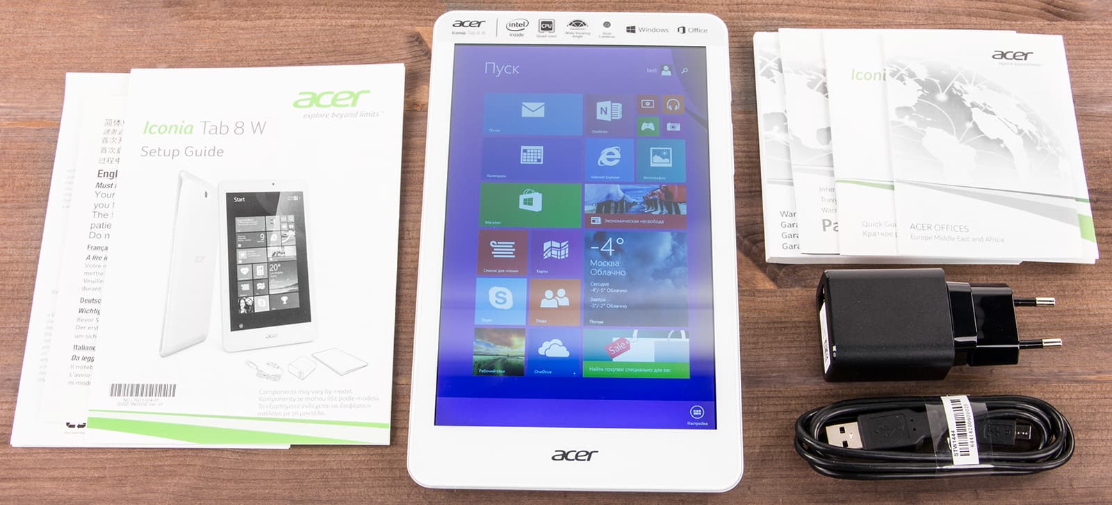 Комплект планшета Acer Iconia W1-810 достаточно стандартный. В небольшой коробке поставляется сам планшет, зарядное устройство с USB-кабелем, руководство пользователя и гарантийный талон.