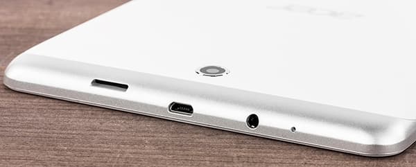 На верхней боковой грани расположены аудиовыход (миниджек) для подключения наушников, разъем Micro-USB 2.0, который используется и для зарядки планшета, и для подключения к нему внешних накопителей и устройств, а также слот для карт памяти microSD.