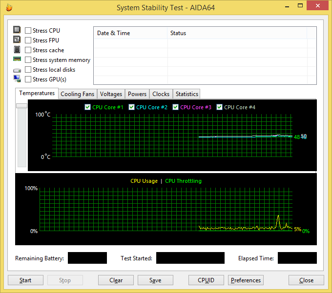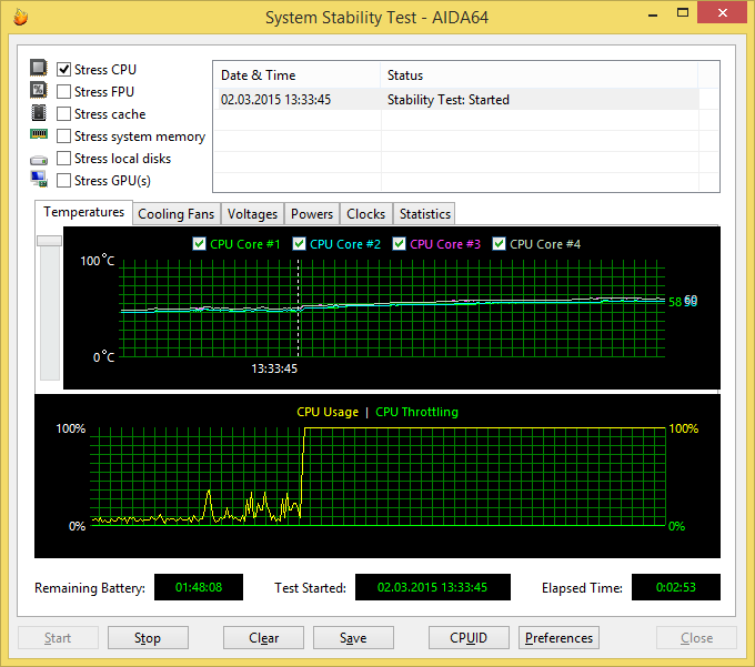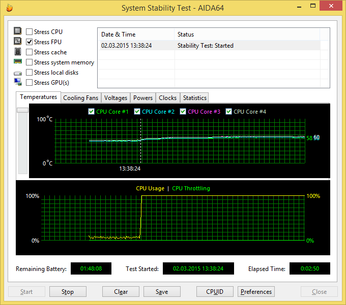 При загрузке процессора тестом Stress FPU максимальная установившаяся частота процессора также составляет 1,58 ГГц, да и температура точно такая же, как в режиме Stress CPU.