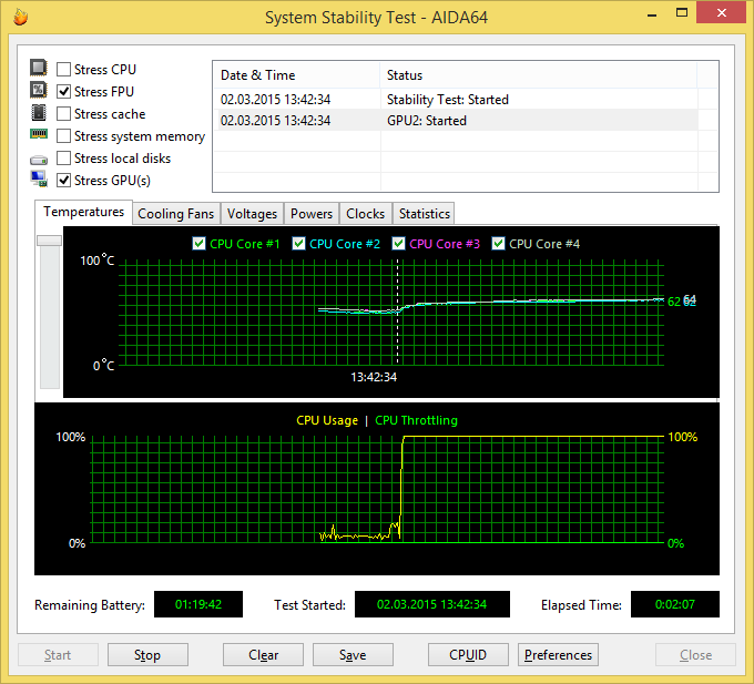 При одновременной загрузке ядер процессора (Stress FPU) и графического ядра (Stress GPU) максимальная частота процессора составляет все те же 1,58 ГГц, а температура не превышает 65 °С.