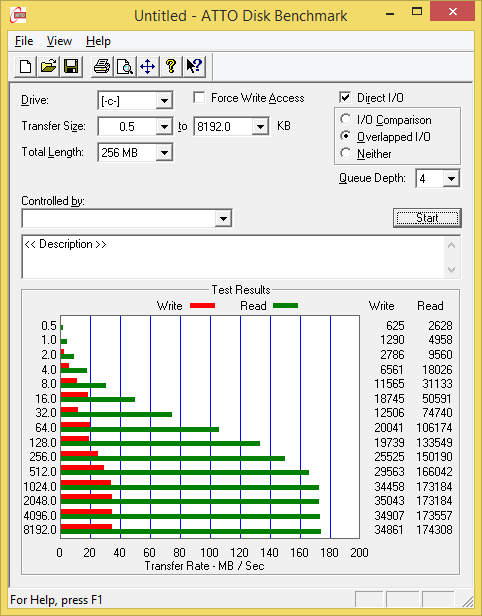 Утилита ATTO Disk Benchmark определяет максимальную скорость последовательного чтения на уровне 173 МБ/с, а скорость последовательной записи составляет только лишь 35 МБ/с. В общем, результаты отнюдь не выдающиеся, но типичные для eMMC-накопителей. Скорость чтения вполне нормальная, а скорость записи очень низкая.