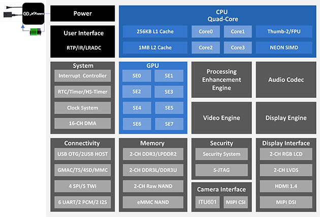 - Allwinner A31 @1 ГГц (4 ядра, ARM Cortex-A7)