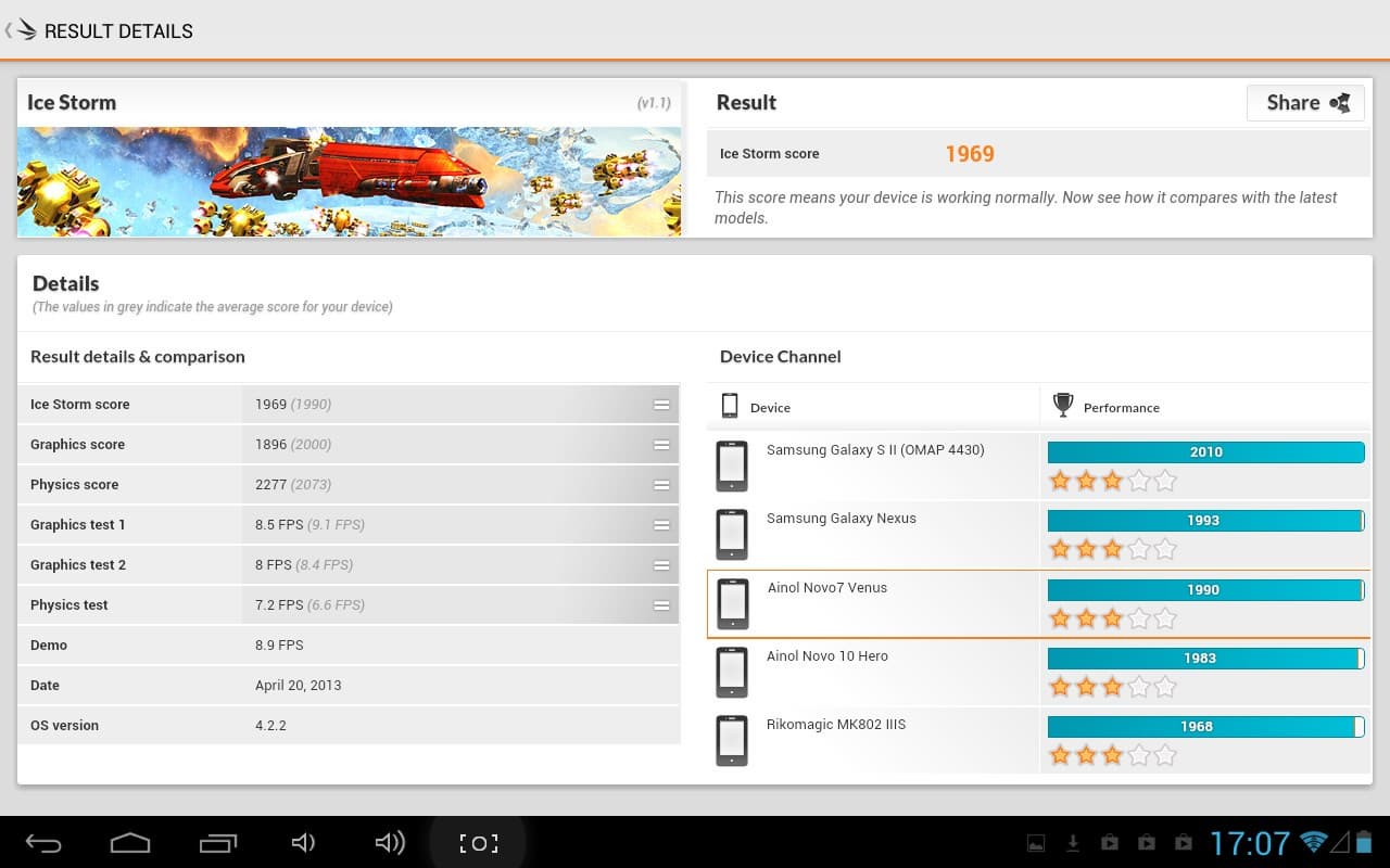 3DMark Ice Storm также обошелся с Novo 7 Venus не слишком любезно, поставив его ниже смартфона Samsung Galaxy S II. Однако здесь примечательно иное: вслед за Novo 7 Venus в списке идет Ainol Novo 10 Hero c двумя ядрами по 1,5 ГГц и Mali-400 MP.