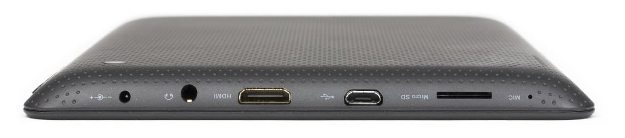 Левая боковая грань содержит все разъемы Novo 7 Venus: микрофон, слот для карт microSD, Micro-USB, Mini-HDMI, а также гнезда для подключения наушников и сетевого адаптера. В наборе можно отметить разве что отдельный разъем для зарядного устройства, хотя для бюджетных планшетов это не является редкостью. Здесь он явно не будет лишним, учитывая поддержку планшетом OTG.