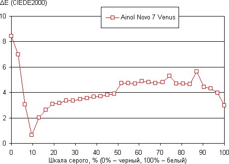 Тем не менее, по факту только точка зеленого немного сдвинута относительно соответствующей вершины треугольника sRGB, поэтому, в общем-то, цвета изображений — рисунков, фотографий и фильмов, — ориентированных на пространство sRGB (а таких подавляющее большинство), имеют более-менее естественную насыщенность. Цветовая температура близка к стандартным 6500 К. Отклонение от спектра абсолютно черного тела (дельта Е) меньше 10, что для потребительского устройства считается хорошим показателем. При этом оба параметра мало изменяются на всей имеющей значение части шкалы серого, поэтому никаких претензий к цветопередаче оттенков серого у нас нет. (Темные области шкалы серого можно не учитывать, так как там баланс цветов не имеет большого значения, да и погрешность измерений цветовых характеристик на низкой яркости большая).