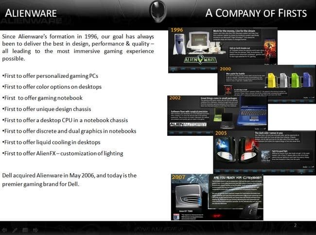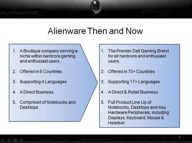 Итак, до 2006 года компания была независимой. Это была маленькая фирма, которая обслуживала всего шесть стран (США, Канаду и четыре страны в Западной Европе) и работала всего с четырьмя языкками. В 2006 года она была куплена Dell, и в настоящее время в планах Alienware — быть представленной по всему миру.