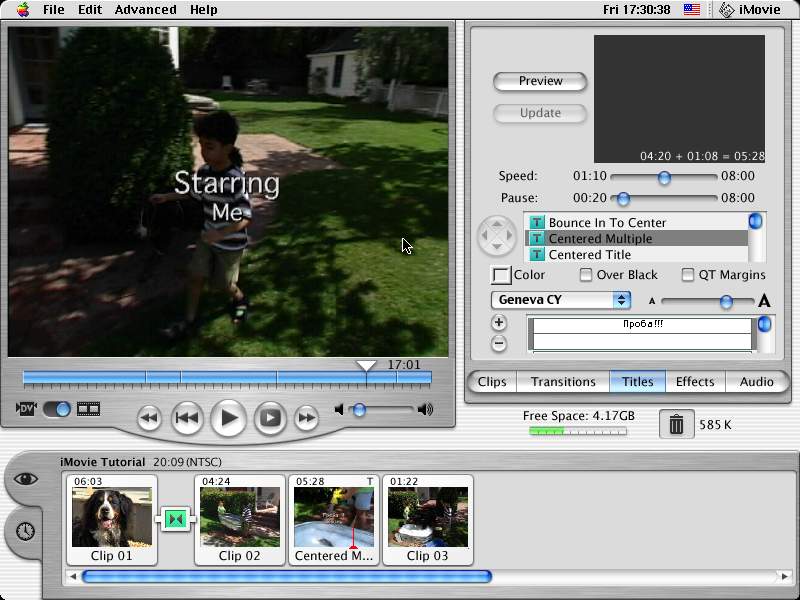 В комплект поставки входит также довольно мощный и функциональный пакет для обработки видео — iMovie. Несмотря на несколько игрушечный интерфейс, он обладает достаточно широкими возможностями монтажа видео. Это и наложение разнообразных видеоэффектов, создание титров, корректировка яркости, контрастности и цветовой гаммы изображения, наложение звукового ряда. Предоставляется неплохая библиотека готовых эффектов, плавных переходов между сценами. Для расчетов используется, конечно, центральный процессор, поэтому большой скорости ожидать не приходится. Однако со своими функциями iMovie отлично справляется — я видел фильм длительностью в полчаса, с эффектами и звуковой дорожкой. Он был создан на PowerBook'е.