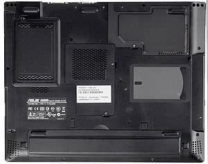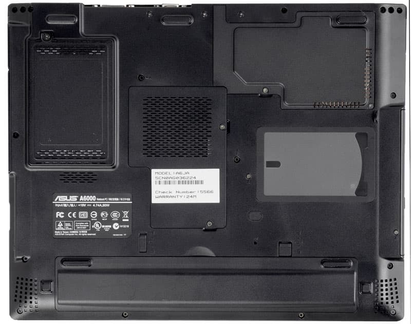 Снизу — крышки отсеков жесткого диска, модулей памяти и плат mini-PCI, аккумуляторная батарея и решетки динамиков, расположенные по углам в передней части ноутбука.