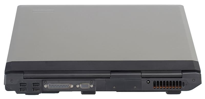 Дизайн ноутбука особенно примечательным не назовешь. Стандартный параллелепипед с «фасками». На этой модели аккумуляторная батарея расположена не сзади, как у большинства последних моделей ASUS, поэтому на заднем торце довольно много разъемов. Здесь расположен параллельный порт и выход на внешний монитор (что логично, хотя само наличие параллельного порта уже вызывает удивление), а также все четыре порта USB, что лично мне не очень нравится. Хотя надо отметить, что USB порты расположены близко к краю корпуса, поэтому пользоваться ими должно быть не так неудобно, хотя подключать устройства все равно придется «вслепую». Посмотрим. Кроме разъемов, здесь расположена выходная решетка системы вентиляции, разъем для замка Кенсингтона и разъем для подключения источника питания.