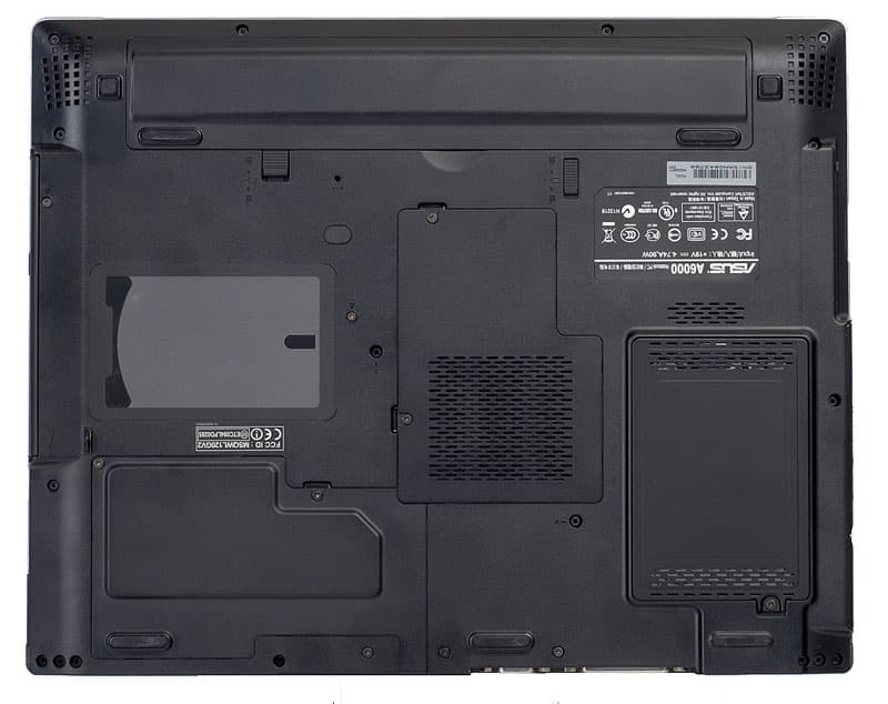 Снизу — крышки отсеков жесткого диска, модулей памяти и плат mini-PCI, аккумуляторная батарея и решетки динамиков, расположенные по углам в передней части ноутбука.