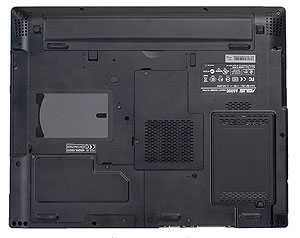 Снизу крышки отсеков жесткого диска, модулей памяти и плат mini-PCI, аккумуляторная батарея и решетки динамиков, расположенные по углам в передней части ноутбука.