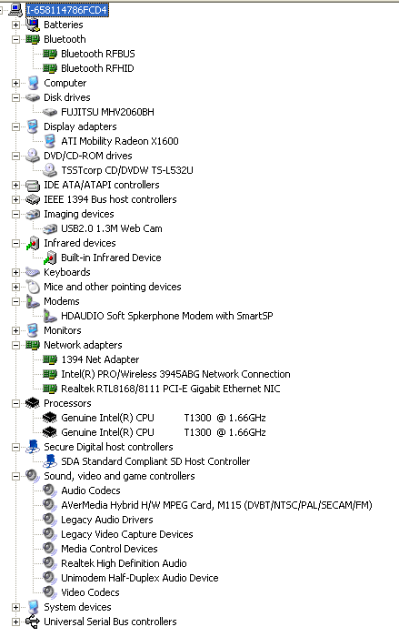 Цифровое телевидение стандарта Digital Video Broadcasting-Terrestrial для нас пока, мягко говоря, в диковинку, поэтому в России модель будет продаваться либо с аналоговым ТВ-тюнером, либо без тюнера. Кроме того, поставляемые в нашу страну ноутбуки будут комплектоваться приводом DVD-SuperMulti Double Layer с поддержкой LightScribe — возможности после записи данных прожигать изображение или надписи на внешней поверхности диска (специального). Конкретные спецификации устройств, установленных на тестируемом экземпляре, можно увидеть на скриншоте вкладки Device Manager.