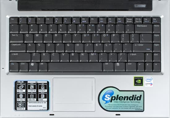 Корпус сделан в традиционном для Asus стиле — серебро «под алюминий» плюс черная пластмасса. Корпус смотрится функционально и просто, как обычный офисный инструмент. Хотя черная ребристая пластмасса мне не очень понравилась. У меня осталось впечатление, что и крышка, и клавиатурная панель некрашеные, соответственно, не должны затираться и менять цвет со временем. Единственное — на крышке побывавшего на тестировании сэмпла уже было несколько достаточно больших царапин, которые заметны на серебристой крышке.Качество сборки корпуса высокое, за исключением того, как вставлена клавиатура. Если надавить ладонями на верхнюю крышку — на середине матрицы появляются круги.