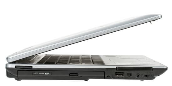 На левой стороне находятся многоформатный картовод (унесен почти к матрице, но пользоваться достаточно удобно), под ним — оптический привод (кнопка открывания сделана в рамке, поэтому не всегда ее удается надавить так, чтобы она сработала, а вслепую нажать ее практически невозможно. Зато исключены ложные нажатия), ближе к передней грани сделан выступ в корпусе, на котором находится порт USB 2.0, IEEE1394 и два аудиоразъема. Над ними расположен разъем Express card.