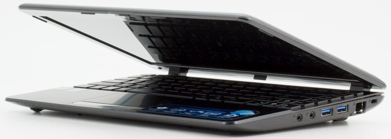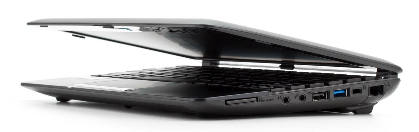 Тогда как у младшей он тоже есть — но на правой боковине. Не совсем удобно расположение здесь аудиоразъемов, поскольку «хвосты» от наушников или гарнитуры будут мешать управлять мышкой с точки зрения правшей. Очень порадовало наличие двух USB-портов, вернее тот факт, что один из этих портов соответствует стандарту 3.0. Для столь компактной модельки это весьма похвально, поскольку и на полноразмерных ноутбуках все еще встречается не повсеместно. Хорошо, что не забыли про разъем замка Kensington, а вот в отношении локальной сети слегка пожадничали, адаптер для нее в данном случае всего лишь 100-мегабитный.