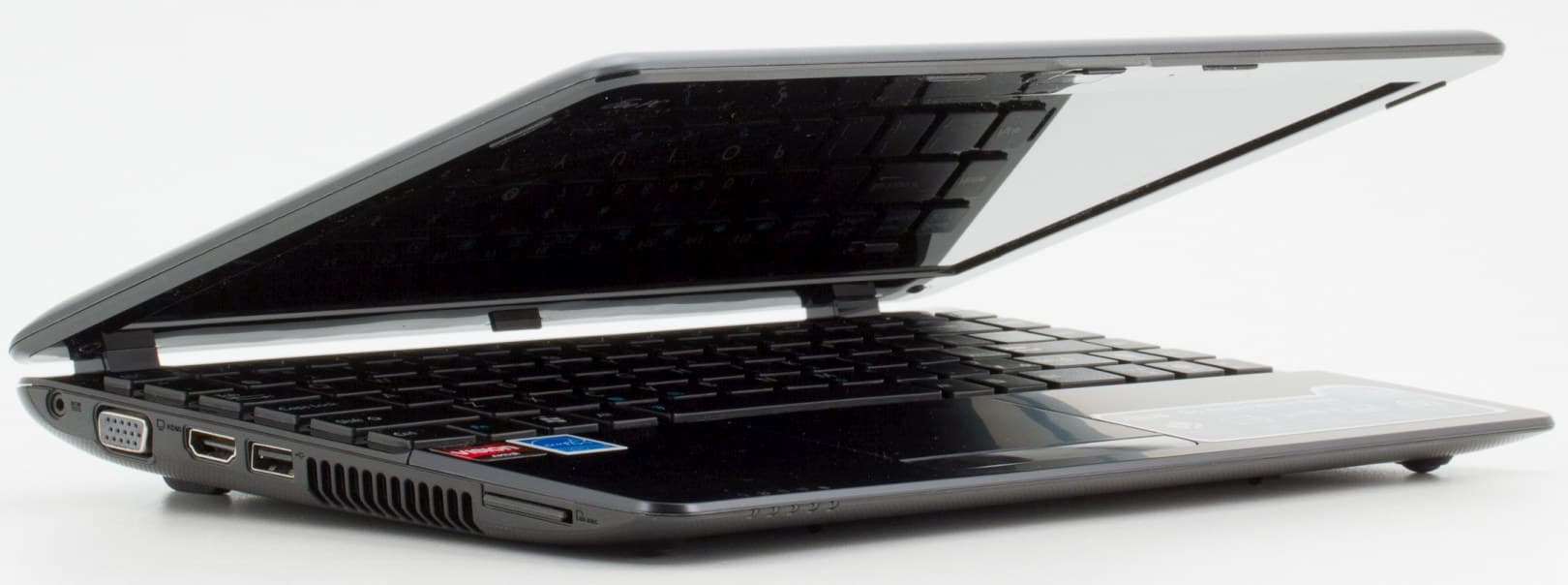 Оснащение также отличается незначительно. Решетка для выхода воздуха расположена в ближнем углу, что нетипично, но не страшно. Воздух оттуда в обоих случаях выходит лишь чуть теплый и лишь при длительной нагрузке становится «просто теплым», поэтому верхней панели нагрев не грозит. Набор портов включает VGA, USB 2.0 и HDMI, в дальнем углу — очень компактный разъем электропитания.