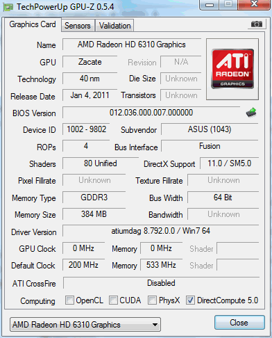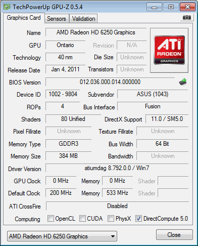 Интегрированное видеоядро носит маркетинговое наименование HD6250, располагает поддержкой DirectX 11 и 80 шейдерными процессорами. Память выделяется из общего объема оперативной памяти, размер буфера можно сконфигурировать в BIOS, но меньше 256 МБ задавать нельзя, если вы планируете воспользоваться ускорением видеодекодирования.