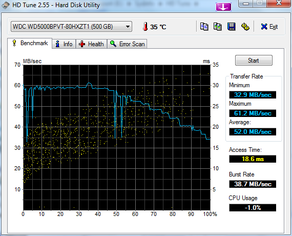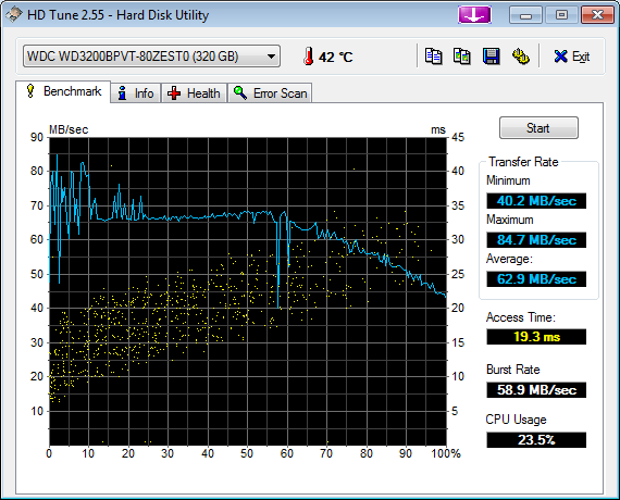 Старшей модели достался более емкий диск, но от того же производителя и даже из той же серии. Казалось бы, откуда взяться разнице? Но она есть. Вероятно при равной плотности записи, магнитные дорожки на менее емком диске располагаются на более «выгодном» участке поверхности (то есть ближе к внешнему радиусу). С другой стороны, график показывает, что и внешние дорожки на первом диске считываются быстрее. Воспримем как факт. Возможно, в таком случае не стоит стремиться к большей емкости, благо модель жесткого диска не привязана в данном случае к той или иной конфигурации. А для мобильного компьютера и 300 ГБ зачастую избыточный объем.