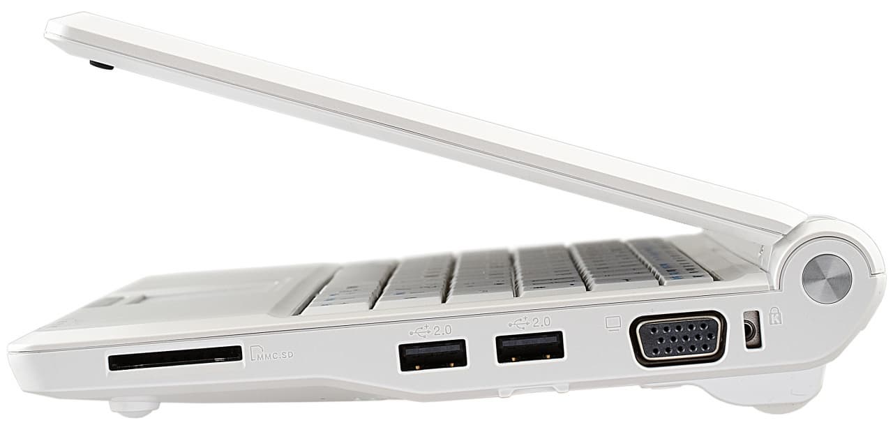 Что касается расширяемости, то для своих размеров, позиционирования и цены ноутбук очень неплохо укомплектован. Во-первых, у него целых три разъема USB 2.0, этого хватит практически на все случаи жизни, например, можно подключить флешку и внешнюю мышь и клавиатуру. EeePC имеет и стандартный выход VGA — при работе на столе можно подключать большой внешний монитор, а «в гостях» — проектор, например, для самостоятельного проведения презентации.