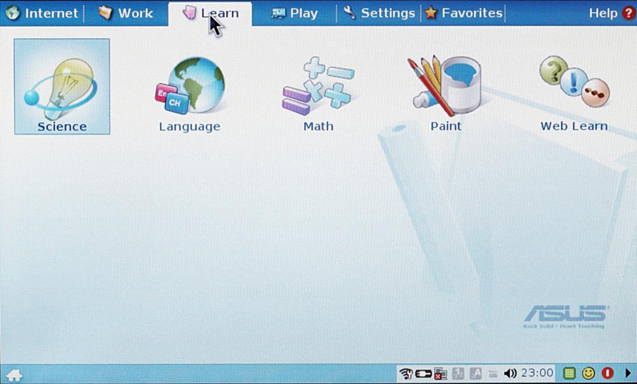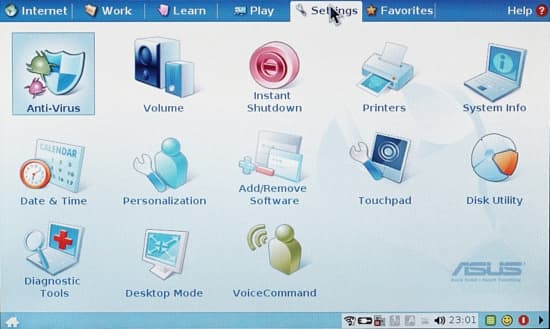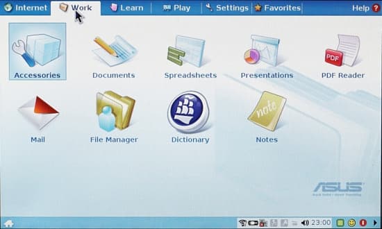 Программная часть Eee PC сделана на основе переработанной версии Xandros Linux — достаточно экзотического дистрибутива. Для выполнения некоторых функций тонкой настройки операционной системы требуется производить нетривиальные действия. В виде "из коробки" количество настроек для работы системы минимально — вывод на внешний монитор, его разрешение, две настройки энергосбережения — вот, пожалуй, и все из интересного.