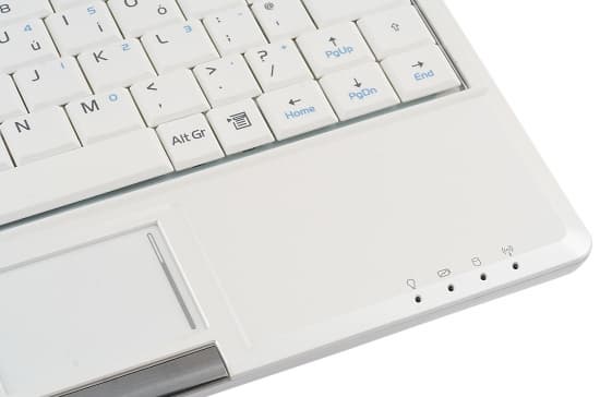 Индикаторы, как уже упоминалось, вынесены на правую переднюю грань клавиатурной панели и выполнены в виде светодиодов, находящихся под специальными отверстиями в корпусе. Всего их 4 — работа, состояние батареи, обращение к жесткому диску, состояние WiFi. При работе ноутбуки перекрываются запястьем правой руки и их не видно.