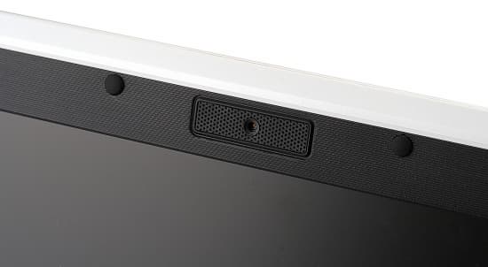 Чтобы вписать небольшой дисплей в корпус, в белую рамку вставлена еще одна (черная). В ней же расположены динамики ноутбука. Такое их расположение удобно — звук идет прямо на зрителя. Только вот динамики очень тихие, пользоваться ими хоть в сколько-нибудь зашумленном помещении трудно, да и качество звука плохое. При сколько-нибудь активной работе со звуком приходится подключать наушники. Сама рамка выглядит в сочетании с белым цвето не очень, а маленький экран в большом корпусе создает ощущение бюджетности модели.