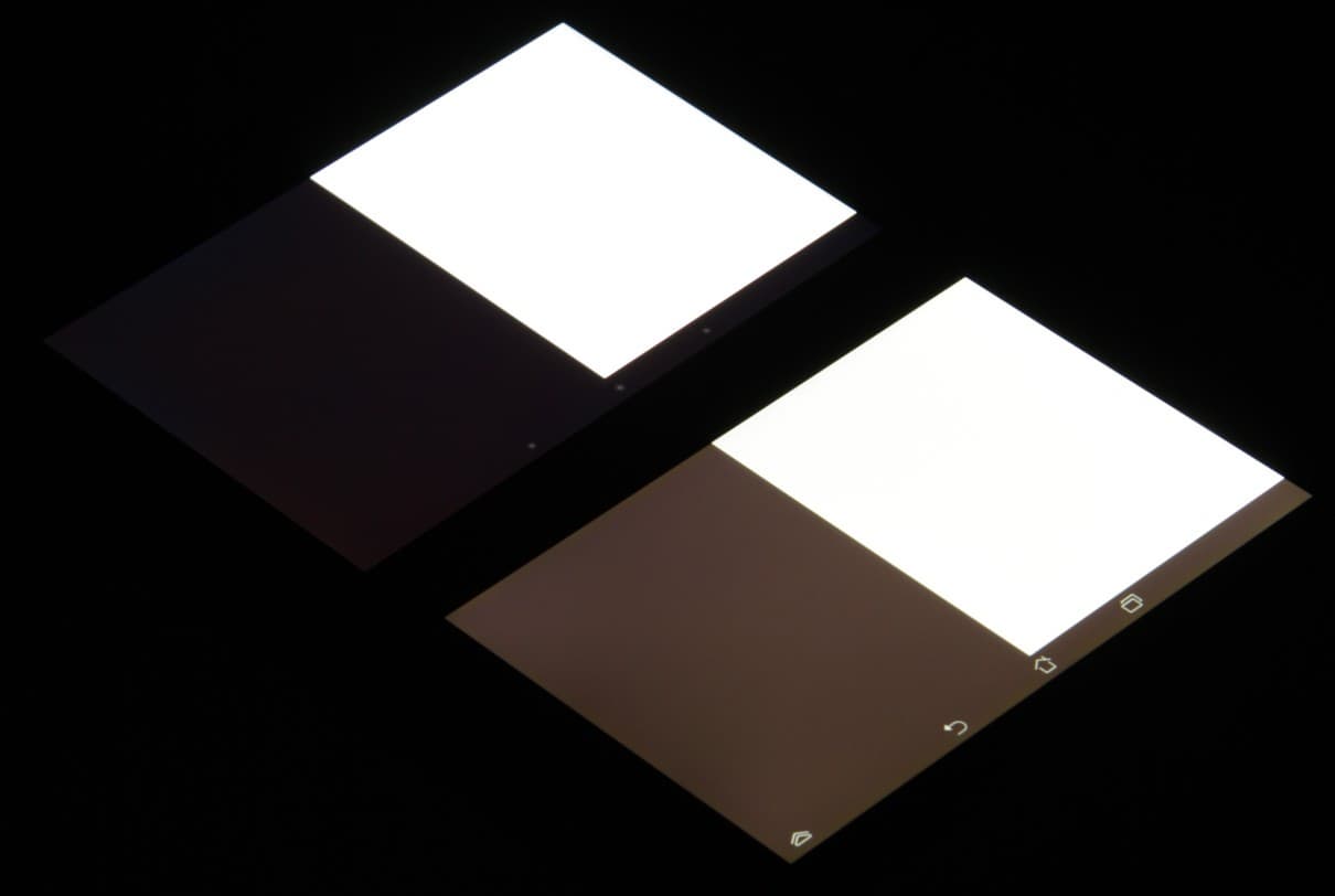 Яркость под углом у обоих планшетов заметно уменьшилась (примерно в пять раз, исходя из разницы в выдержке), но в случае Fonepad 7 падение яркости чуть больше (яркость по фотографиям 226 против 237 у Nexus 7). При этом цветовой тон изменился несильно. Черное поле при отклонении по диагонали высветляется сильно и приобретает красно-фиолетовый или желтоватый оттенок. Фотография с Nexus 7 для сравнения это показывает (яркость белых участков в перпендикулярном направлении у обоих планшетов одинаковая!):