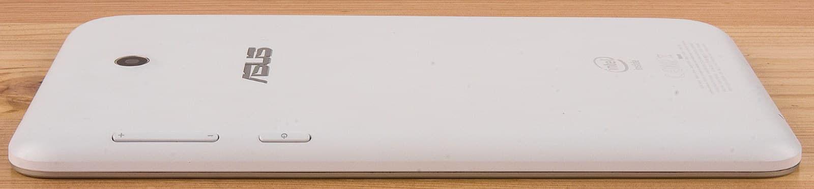 Посередине корпуса выровнена камера и логотип Asus. Снимок создает впечатление, что боковые кнопки Android находятся на задней панели. На самом деле так оно почти и есть: механические клавиши вынесены прямо туда, где покатая задняя панель переходит в плоскость. Если нажать в определенной точке около экрана, пока планшет лежит на столе, механические кнопки сработают.