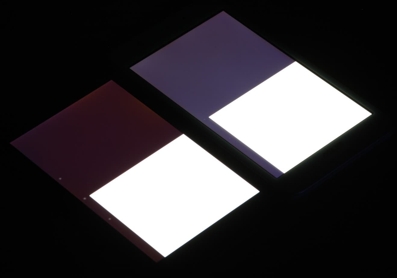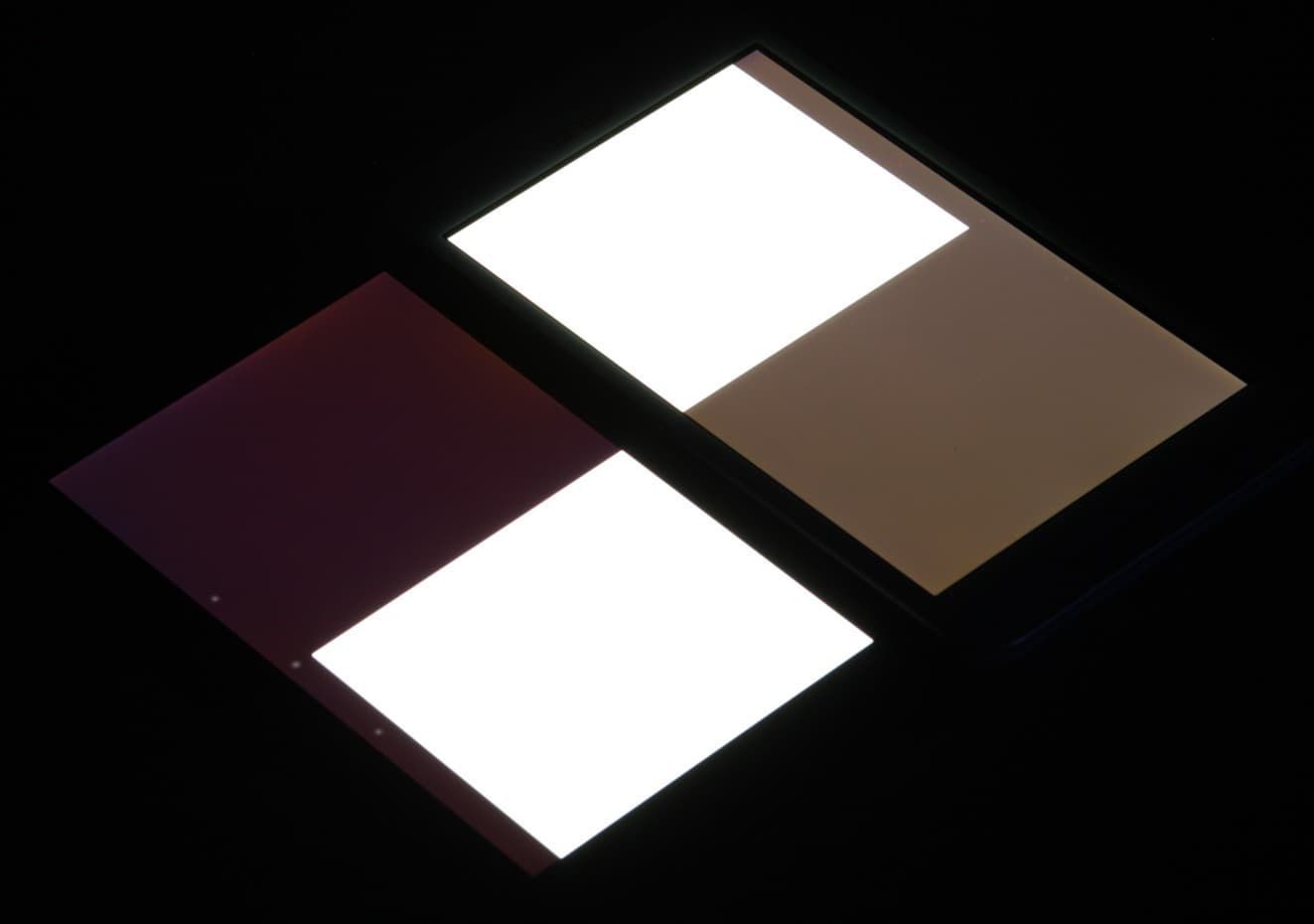 Яркость под углом у обоих планшетов заметно уменьшилась (как минимум в 5 раз, исходя из разницы в выдержке), но в случае Asus Fonepad (FE375CG) яркость экрана под этим углом все же заметно ниже. Черное поле при отклонении по диагонали высветляется очень сильно, и приобретает фиолетовый или красно-фиолетовый оттенок. Фотография с Nexus 7 для сравнения это показывает (яркость белых участков в перпендикулярном направлении у обоих планшетов примерно одинаковая!):