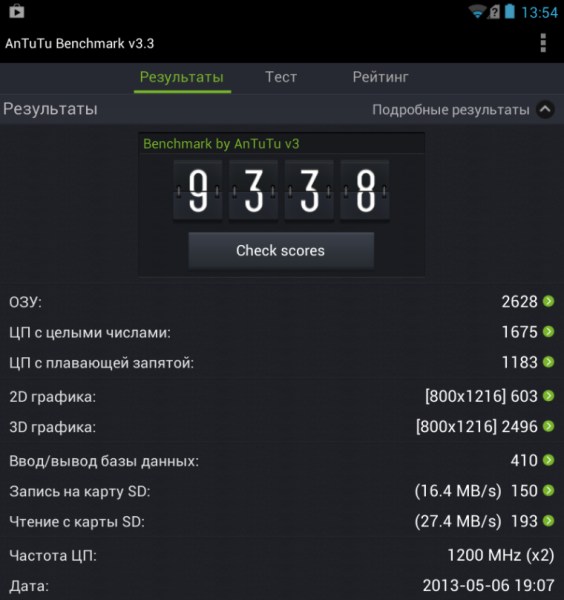 В Geekbench 2 ASUS Fonepad в итоге немного отстал от Ainol Novo 7 Venus, уступив ему в процессорной производительности, но уже ожидаемо обогнав по скорости оперативной памяти.