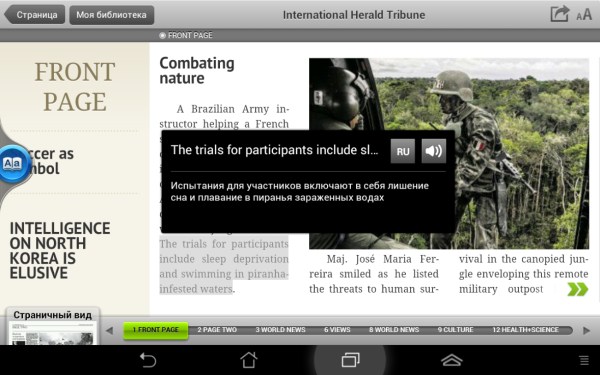 В планшете установлен очень удобный словарь Instant Dictionary, работающий поверх любой запущенной программы. Включать и выключать словарь можно не выходя из нее, при помощи кнопки у левого края. Когда словарь включен, достаточно провести линию по тексту, который нужно перевести, и во всплывающем окне появится перевод. Там же можно изменить язык перевода и озвучить исходную фразу.
