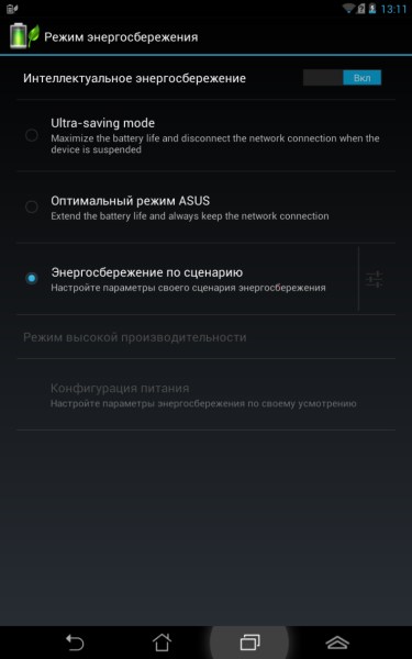Производитель серьезно поработал над энергоэффективностью ASUS Fonepad. Пользователи могут выбрать один из готовых сценариев энергосбережения, а также настроить свой, регулируя уровни яркости:
