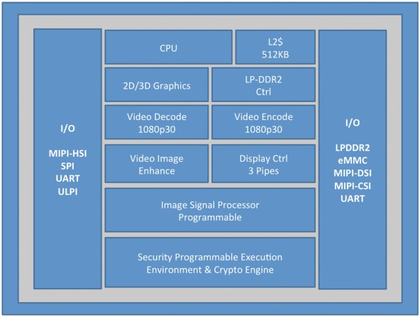 - Процессор для обработки изображений частотой 320 МГц, поддерживающий фронтальную камеру разрешением до 8 Мп и тыловую разрешением до 1,3 Мп, а также аппаратное декодирование и запись видео разрешением до 1080p и частотой до 30 кадров в секунду