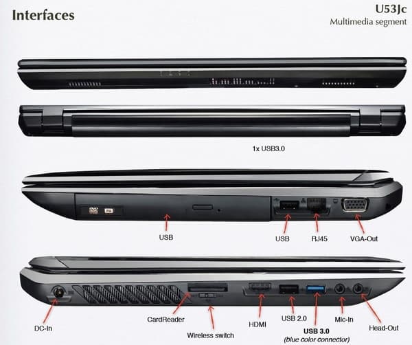 Вполне неплохая по характеристикам универсальная модель, отличающаяся относительно небольшим для своих размеров весом. При этом ноутбук в меру производительный, включая новую переключающуюся графику от NVIDIA. Cтоит отметить, что в этой модели уже есть порт USB 3.0. Кстати о портах, посмотрим на их расположение.