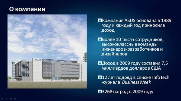 Компания ASUS на данный момент может похвастаться долгой историей: она была основана в 1989 году. На слайде представлены самые интересные факты о ее деятельности в 2009 году.