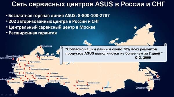 Однако даже несмотря на то, что в целом продукция ASUS достаточно надежна, компания уделяет немало внимания тому, чтобы пользователи, у которых все-таки произошла поломка, как можно быстрее могли получить помощь — и отремонтированную (или замененную) деталь. Компания создала в России развитую систему поддержки пользователей, включающую в том числе и разветвленную сеть сервисных центров.