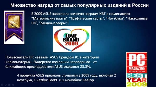 Однако ASUS не просто предлагает хорошие качественные продукты. Одним из важнейших аспектов деятельности компании является работа с покупателями и пользователями техники. Поэтому, как показывают многочисленные опросы общественного мнения, эта марка является очень популярной на российском рынке.
