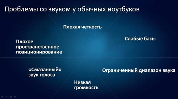 В общем-то, давно известно, что человек много времени воспринимает ту или иную звуковую информацию. В то же время очень долго производители ноутбуков полностью игнорировали эту сферу, да и сейчас хорошая акустика — удел лишь некоторых моделей ноутбуков. Сейчас пользователи становятся все более требовательными, и хорошая звуковая подсистема становится весомым плюсом при покупке ноутбука домой, особенно если речь идет о мультимедийной машине, на которой будут, например, смотреть кино.