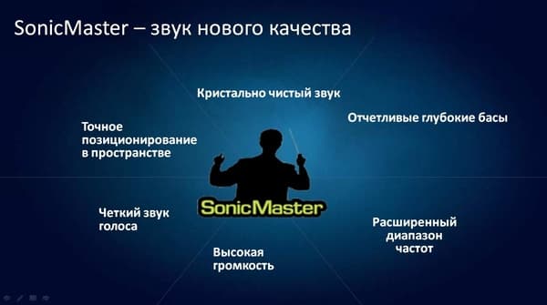 Практически все недостатки очень здорово проявляются в обычной жизни, я неоднократно упоминал о них в своих обзорах. Соответственно, технология SonicMaster призвана добиться более качественного звука. Какого? Это сформулировано на следующем слайде.