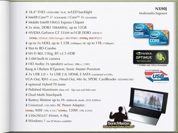 Как видите, отличаются они разными процессорами (двух- и четырехъядерным). Соответственно, Jn поддерживает технологию NVIDIA Optimus, а Jq имеет гораздо более высокий уровень производительности, что видно по цифрам на слайде. Кстати, нужно отметить, что из-за разных процессоров у этих ноутбуков разные материнские платы. Вот подробные спецификации серии NX90J.