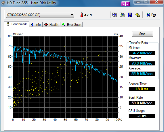 Среднее значение производительности диска от Seagate несколько ниже по сравнению с моделью Western Digital того же объема, установленной в сравниваемом ноутбуке от Dell.