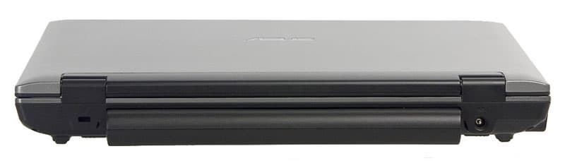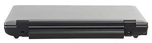 Задний торец, как это стало уже привычно для современных ноутбуков, почти целиком занят аккумуляторной батареей. Стандартная батарея целиком «укладывается» в габаритные размеры корпуса, а вот входившая в комплект тестировавшегося образца батарея повышенной емкости из 9 ячеек уже выступает сзади. Слева от аккумулятора расположен разъем для замка Кенсингтона, справа — разъем для подключения источника питания.
