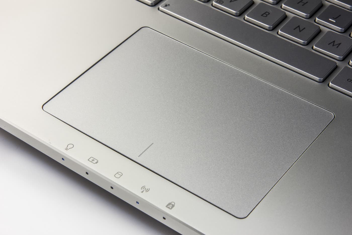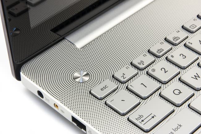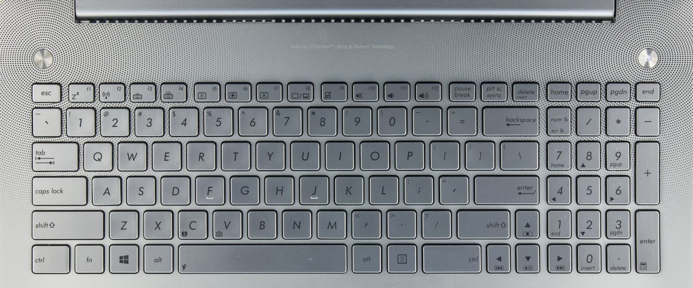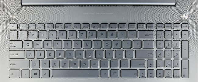 Очень светлая, практически белая клавиатурная панель выполнена из алюминия, и фактура материала дает существенный вклад в общий облик ноутбука: она создает впечатление чистоты. Правда, в N550Jv в верхней части вокруг кнопок краской нарисованы концентрические круги из точек. В первых моделях серии N они маскировали дырочки от динамиков, расположенных над клавиатурой, но в нашем ноутбуке динамиков здесь нет, так что раскраска служит чисто декоративным целям. Клавиатура у Asus N550Jv тоже светло-серебристая, примерно того же оттенка, что и клавиатурная панель.