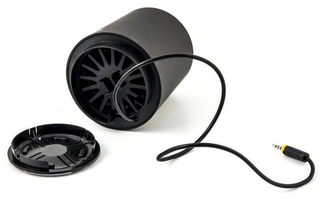 На задней стенке ничего нет, ее закрывает откинутая крышка. На передней — тоже: верхняя часть — металлическая, нижняя — скошенная пластиковая, в ней расположены динамики модели.