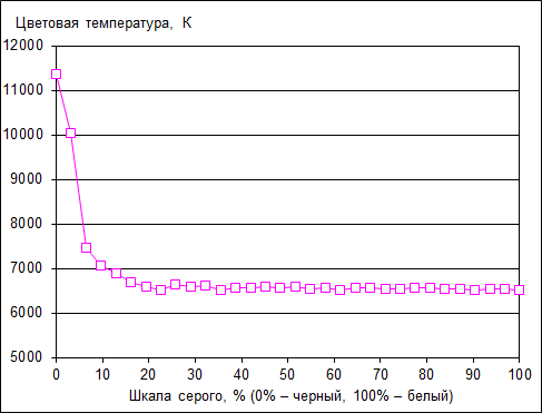 Цветовая температура экрана очень стабильна, и ее значение составляет примерно 6500 K во всем диапазоне по шкале серого. И лишь в темной области (менее 10% белого) цветовая температура увеличивается до значения более 11000 К. Впрочем, вариация цветовой температуры в темных тонах — это не критично и вполне допустимо.