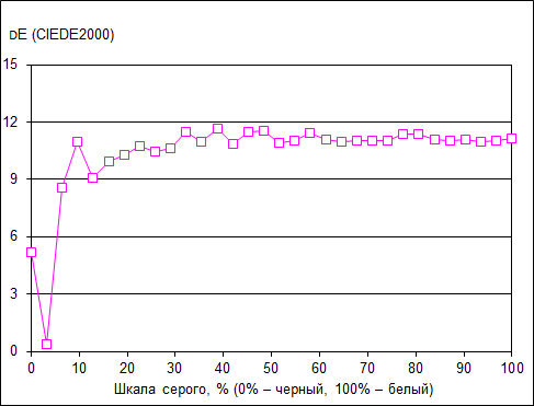 Что касается точности цветопередачи (дельта Е), то, увы, здесь рассмотренному экрану похвастать нечем. При доле белого более 10% (по шкале серого) значение дельта Е составляет порядка 10 единиц. Конечно, говорить о правильной цветопередаче в данном случае нельзя.