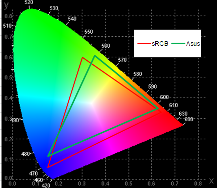 Цветовой охват ЖК-экрана не только меньше, чем охват sRGB, но и сдвинут относительно охвата sRGB. В принципе, это вполне типичная ситуация для недорогих ЖК-матриц, используемых в ноутбуках.