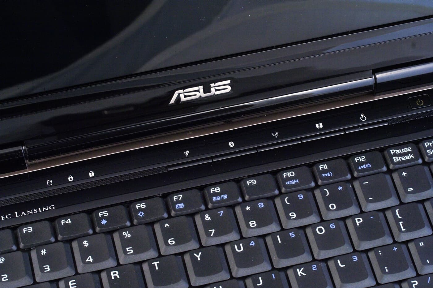 Индикаторы в ASUS N81Vg разделены на две группы. Основные рабочие индикаторы расположены на передней грани клавиатурной панели. Это квадратные диоды, светятся салатово-зеленым светом через маленькие дырочки в панели. Всего их четыре: индикатор работы, индикатор состояния батареи (при работе от батареи не горит, при заряженной батарее не горит — индикация неудовлетворительна), индикаторы отдельно Bluetooth и отдельно Wi-Fi. Из-за того, что крышка ноутбука не доходит до края корпуса, их видно и тогда, когда ноутбук закрыт. При печати они перекрываются запястьем левой руки.